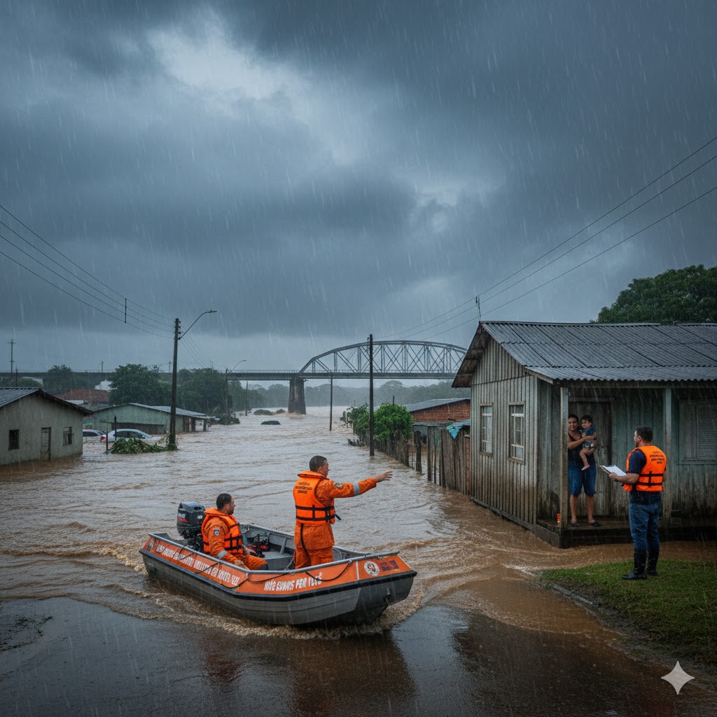 Mobilidade: Nunca tente atravessar ruas ou pontes cobertas por água. A força da correnteza pode arrastar veículos e pedestres mesmo em lâminas baixas.